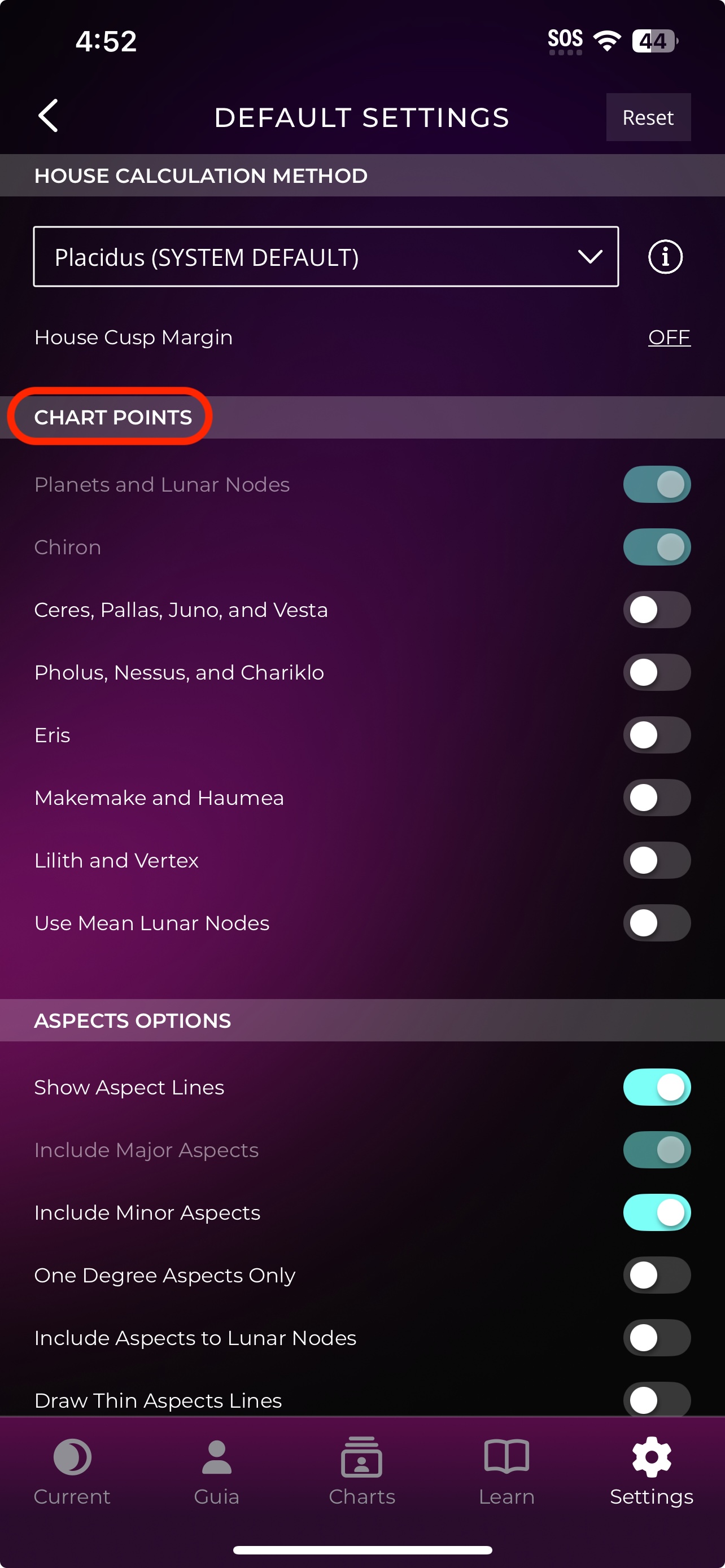 Just head to the Settings tab, then tap on Default Settings > Chart Points. From there, use the toggles to turn on any additional points you’d like to include in your charts.